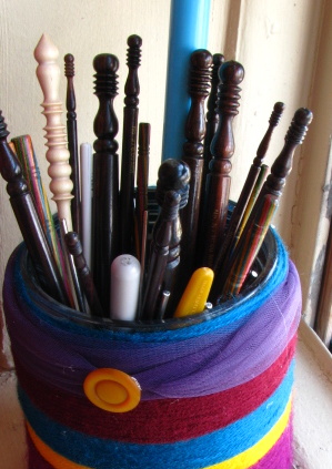 I might have to steal that idea. 🙂 Was that just yarn wrapped around and glued to the jar? That’s a great idea to use up some scrap yarn. Looks a lot better than the giant plastic bin currently holding all my hooks and needles.