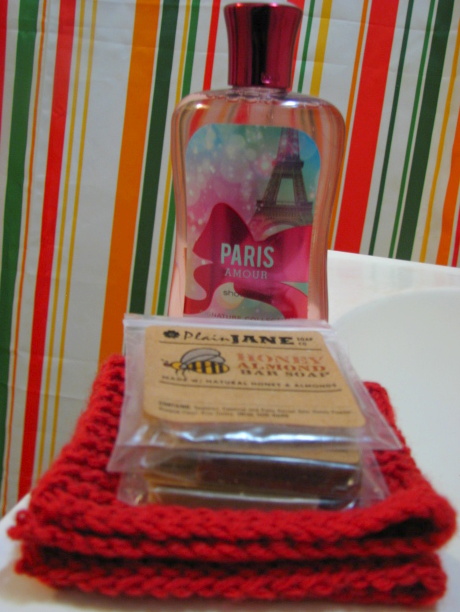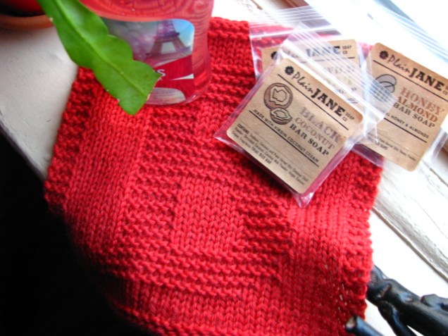 I needed to make my friend a gift and I know she loves hand-made soap.   I know some knitters find making dish-cloths and face-cloths useless, but what’s a better combo as great gift for a handmade soap lover than some handmade soap (made by my co-worker) and face-cloths made with love?  But that’s a story for later …