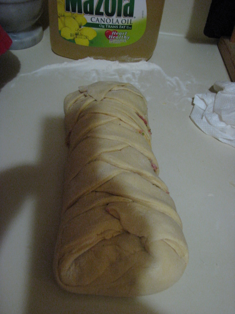 I was so ecstatic, I made a braided bread.  I used Pillsbury Cresent Rolls dough, tossed some veggies, chopped peppers, chopped onions/chives, buffalo sauce, minced sausage and shredded mozzarella/cheddar cheese mix together and boom, I got this: