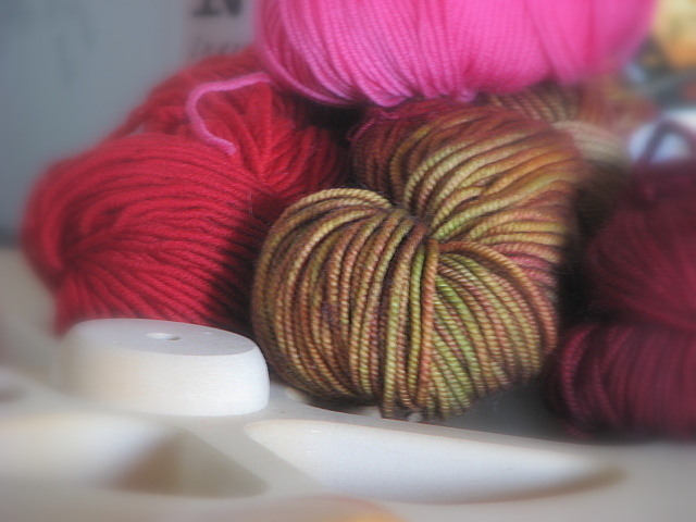 Tosh, Bliss, Acamy own treat: (l to r) Araucania Toconao Solid in color 502, Tosh Chunky in Magnolia Leaf, Tosh Chunky in Tart.  Perched on top is Debbie Bliss Sublime (Baby Cashmere) in Shade 301.  The reds and pinks are colors I don’t typically buy, but I’m trying to get out of my comfort zone this birth year, so I figured I could start here.