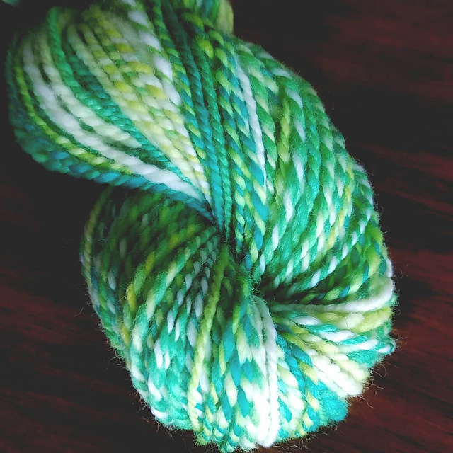 The third bump was even better, although the yarn weight turned out to be worsted/aran weight. It was much more consistent, I got the barberpoling I wanted, and there were no over-spun, squiggly bits!