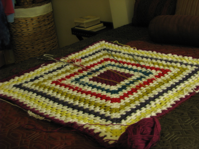 It’s not much further on from the last time you saw it in February but that right there is my problem. I’m eight weeks behind and the square is almost off the sides of my bed. If I add another 32 rounds to this it definitely will be. In the long term, we have 38 more weeks in the year. If I multiply 38 * 4, I get an additional 152 rounds on this blanket. Which means that it would be trailing on the floor around my bed as opposed to being the comfy blanket / spread I envisioned if I keep making it in it’s current style. In other words — it’ll be toooooooo big. Too big to be practical and too big to even wash in the largest washing machine in my building’s laundry room. So what’s a girl to do? I kinda know already what I want to do, but I need your help.