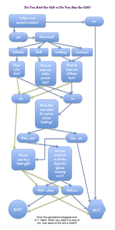 This hysterically funny diagram from Panopticon really helped me asked my own questions to narrow down who’s yarn-worthy and who’s not; go through it, you might find that you either have more yarn-worthy people in your life or … less. 😀