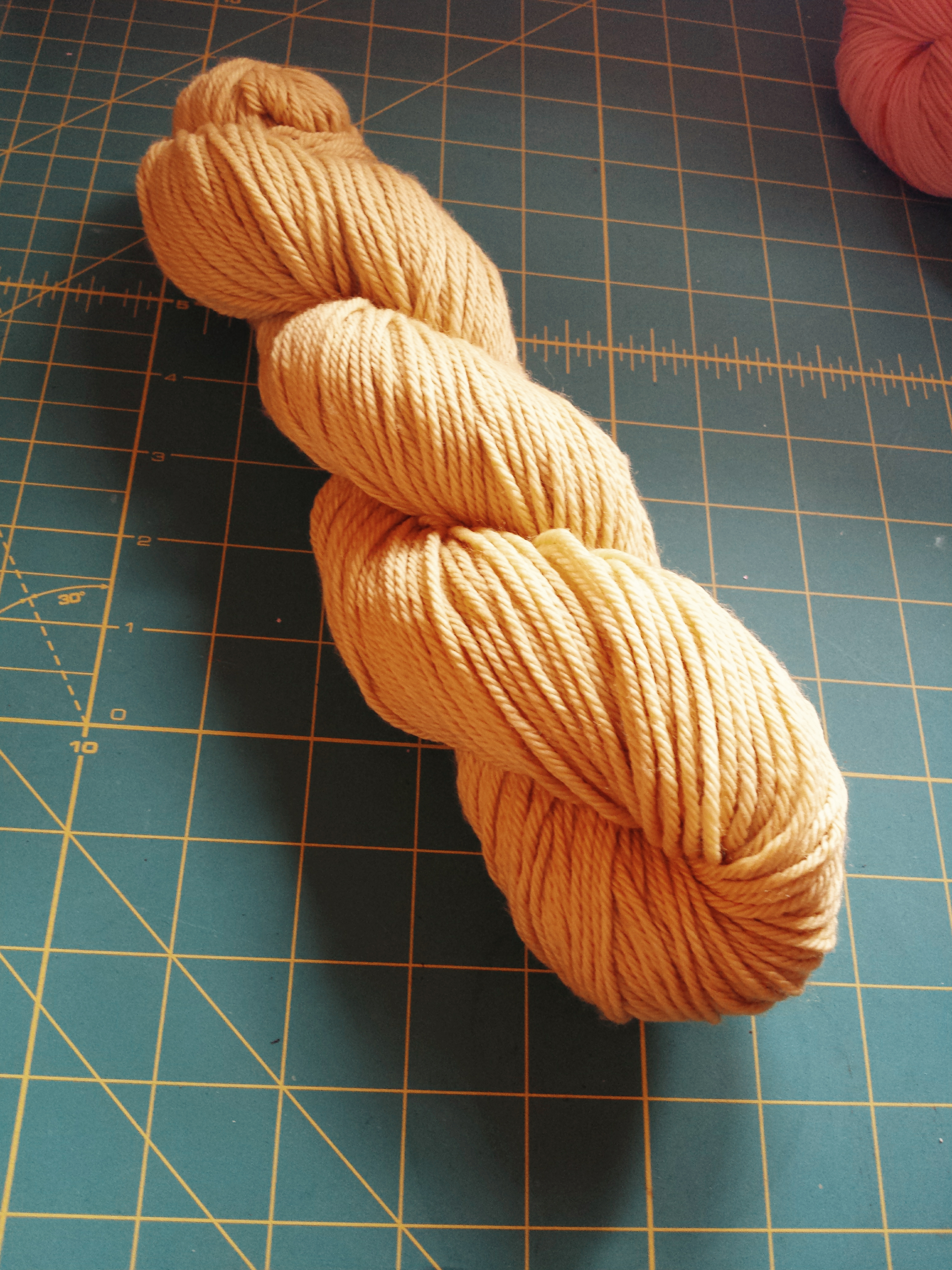 In the meantime, I took a break from my acrylic saga and dyed these two beauties. The fiber is 100% merino for both — the orange one done with acid dye and the light brown with natural dye extract from the Cutch tree.