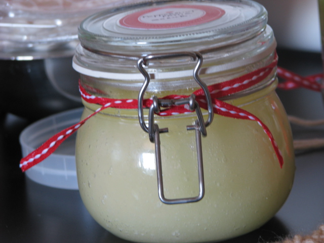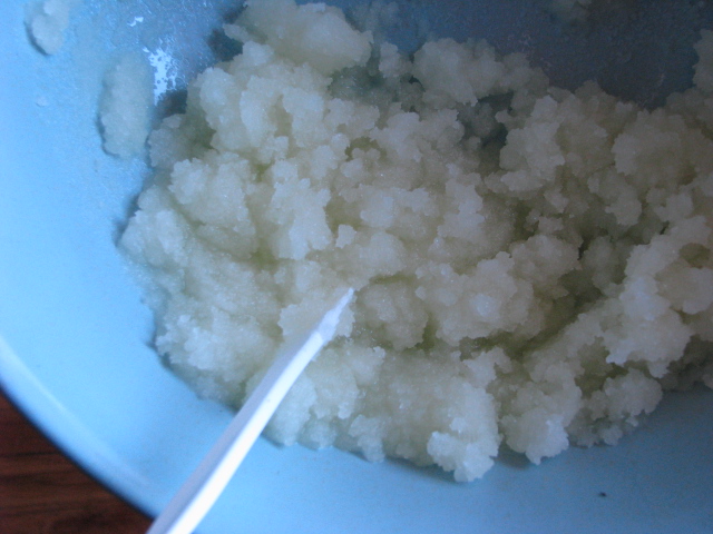 Basic Ingredients: 2 cups white sugar, 1/4 cup olive oil, 3/4 cup grapeseed oil, (I used a 2:1 ratio between the sugar and the oil), 5 – 6 drops each of peppermint and dark chocolate fragrance oil, Ikea container.