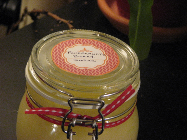 - Another blessing came this week from my friend Lisa. She came over yesterday and we had a blast … as usual. She ended up spending the entire afternoon and evening at my place doing what good girlfriends do best: clowning each other, encouraging each other, having a few “spirits” aka beer with each other 😉 , laughing until you cried with each other. It was so good to be in the company of a wonderful friend. Like Maya Angelou said ” there is an intimate laughter to be found only among friends.” I got more proof of that yesterday. As a “thanks for visiting” and just because she’s all around awesome, I made another scrub for her — this one pomegranate scented. Smelled sooooooooooooooooooooo good!