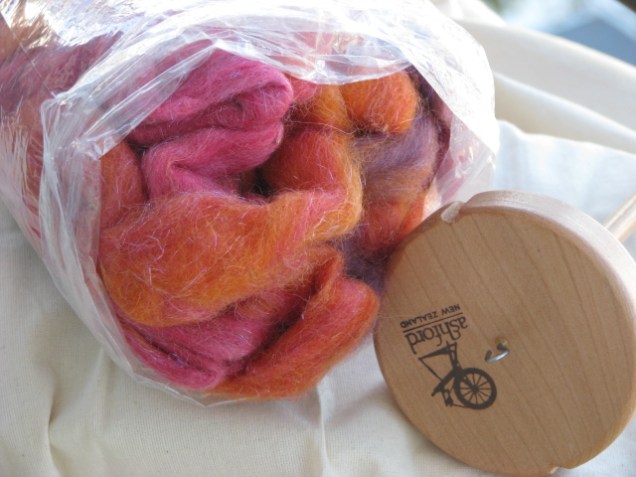 Self Stripe Roving from Painted Spring Farm Alpaca and an Ashford top-down spindle from another vendor.
